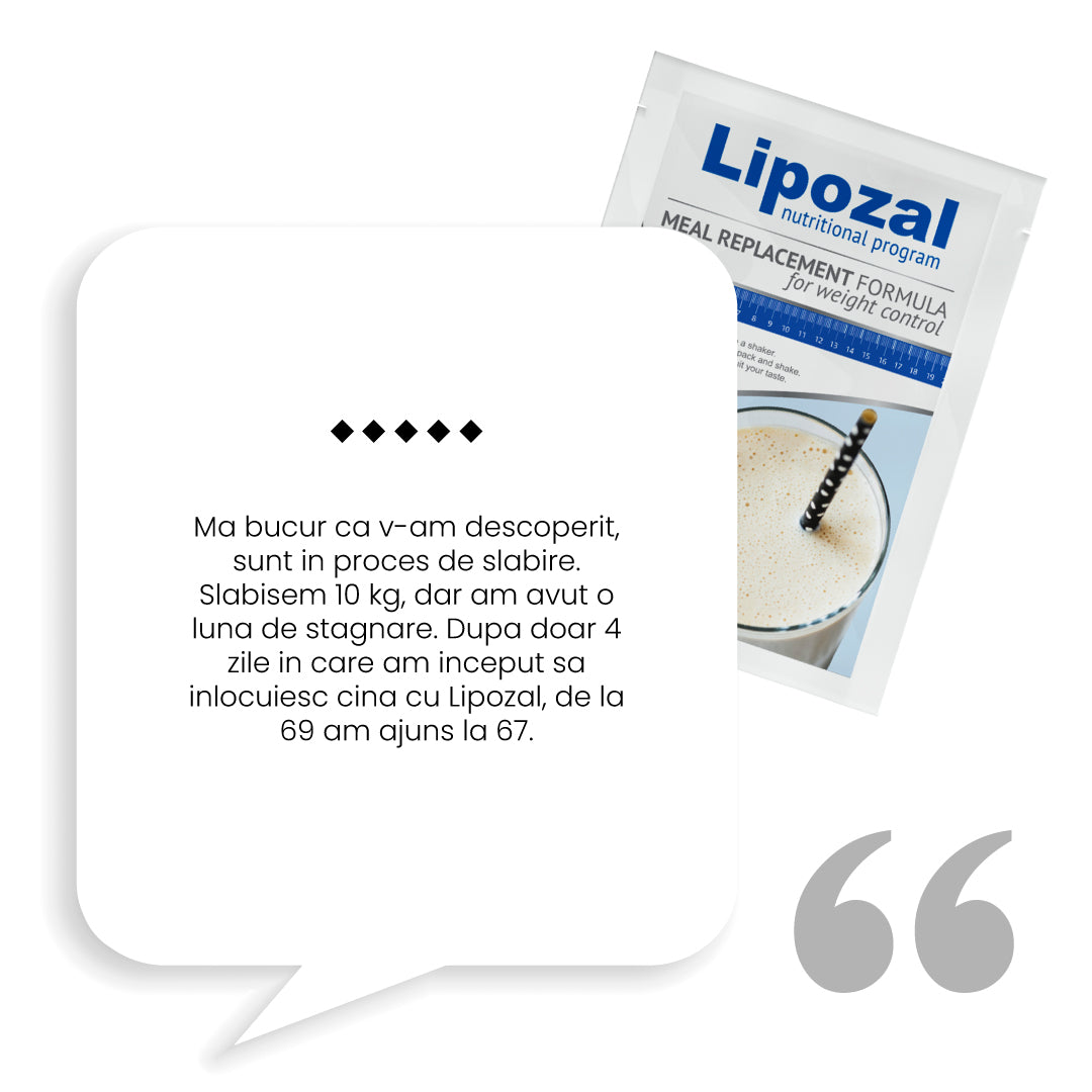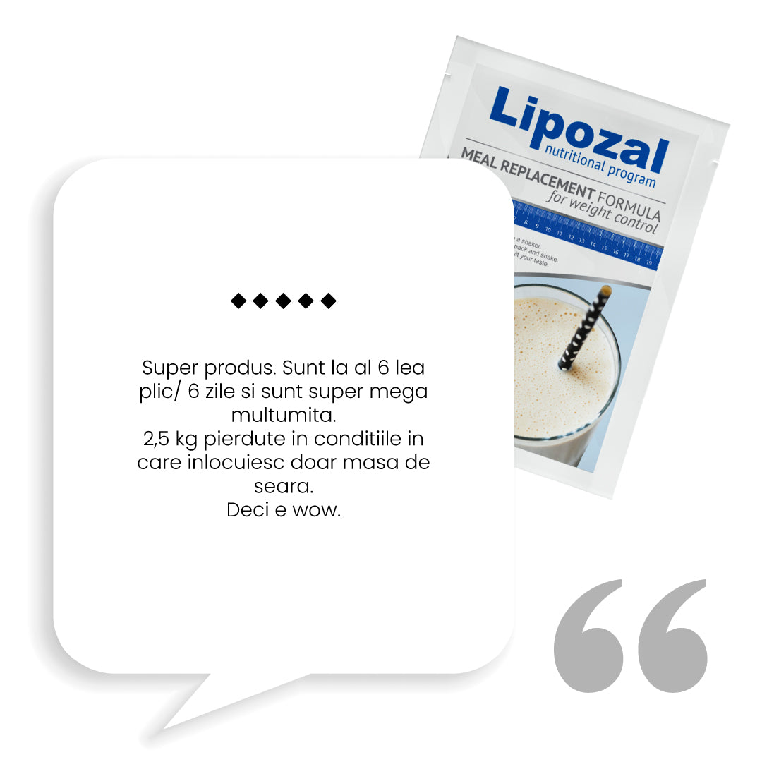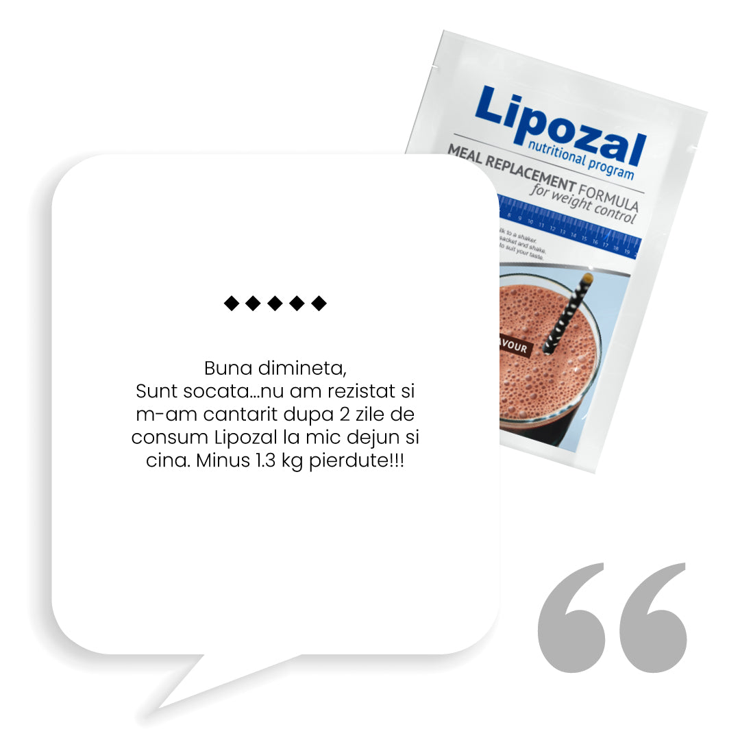 In timpul zilei mai inlocuieste o masa cu bautura Lipozal. Aceasta contine ingrediente active care ajuta la scaderea in greutate, stimuleaza metabolismul sa arda grasimea din organism si reduce pofta de mancare.