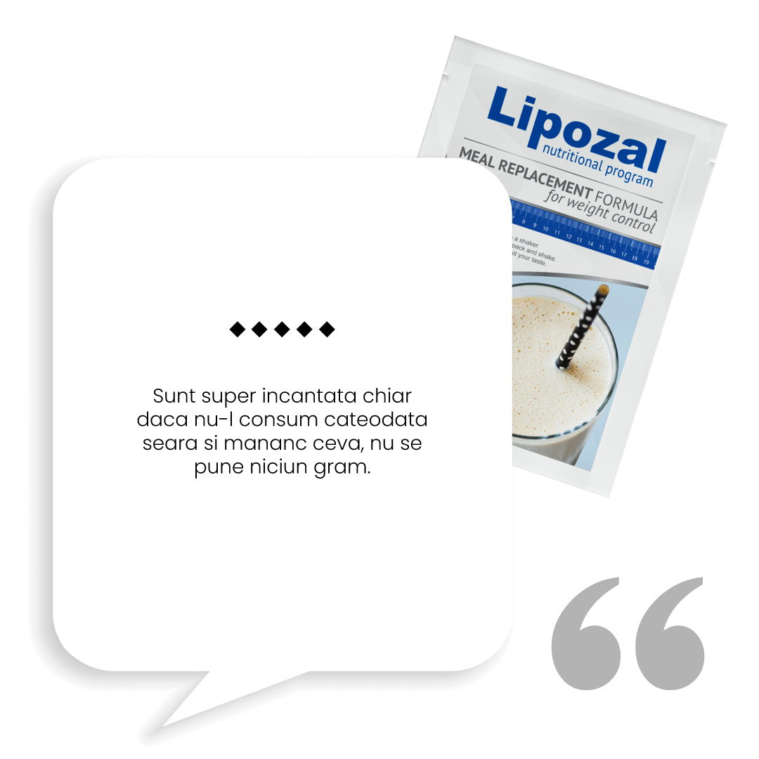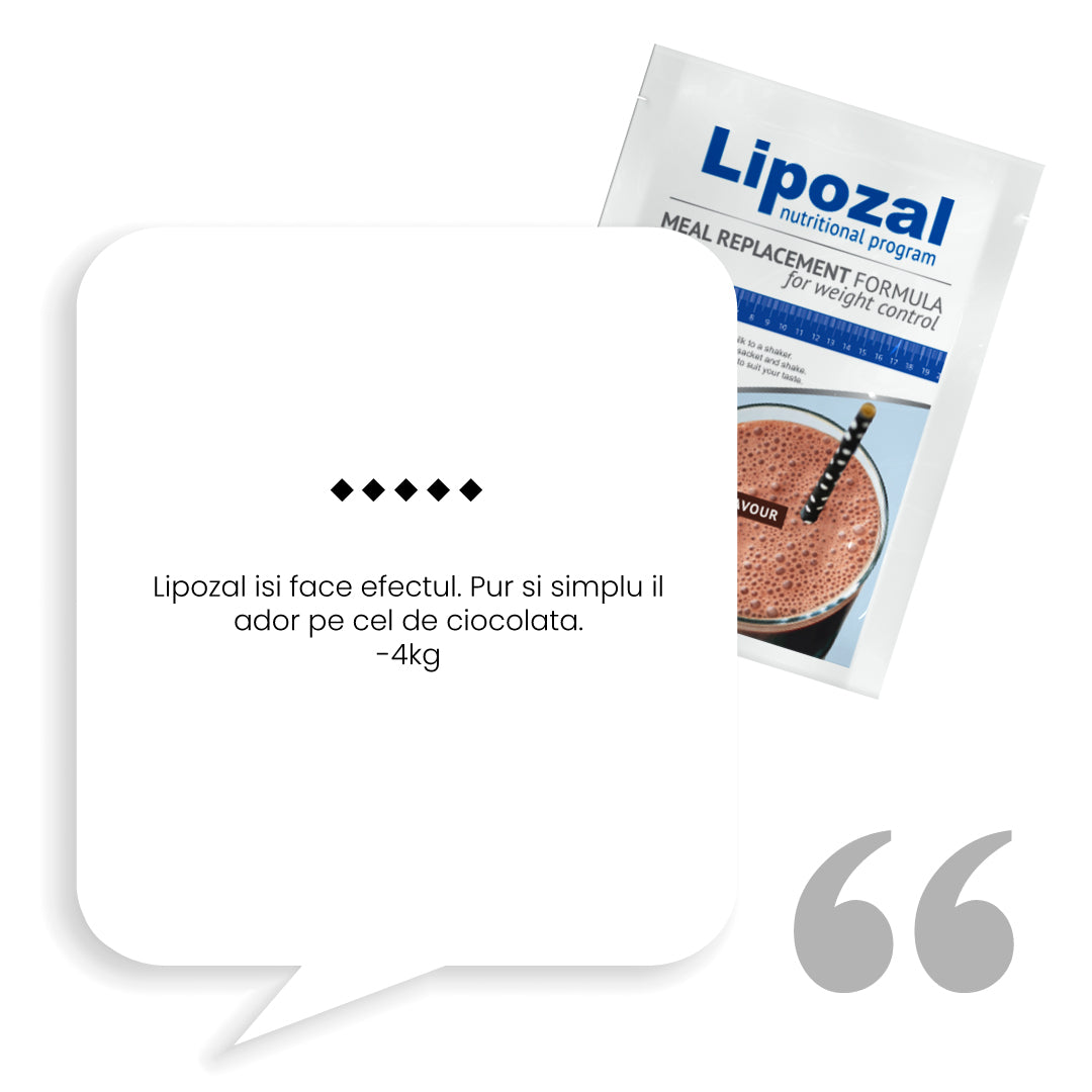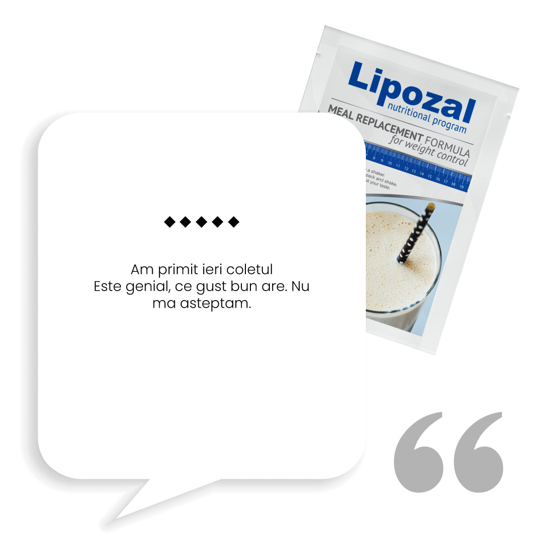 In timpul zilei mai inlocuieste o masa cu bautura Lipozal. Aceasta contine ingrediente active care ajuta la scaderea in greutate, stimuleaza metabolismul sa arda grasimea din organism si reduce pofta de mancare.